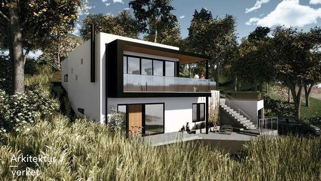 Eiendommen ligger flott til i en vestvendt skråning med panoramautsikt over Oslo-fjorden i Son. Boligen består av to etasjer, hvor hovedetasjen byr på stor romlighet med flott utsikt fra kjøkken og stuedel. Utearealene er tilpasset til boligens underetasje og garasjetak. Underetasjen består av sekundærrom med blant annet stue, soverom, bad og bod. Boligen har direkte inngang fra garasjen. Dempede materialvalg med detaljer som fremhever byggets formspråk.