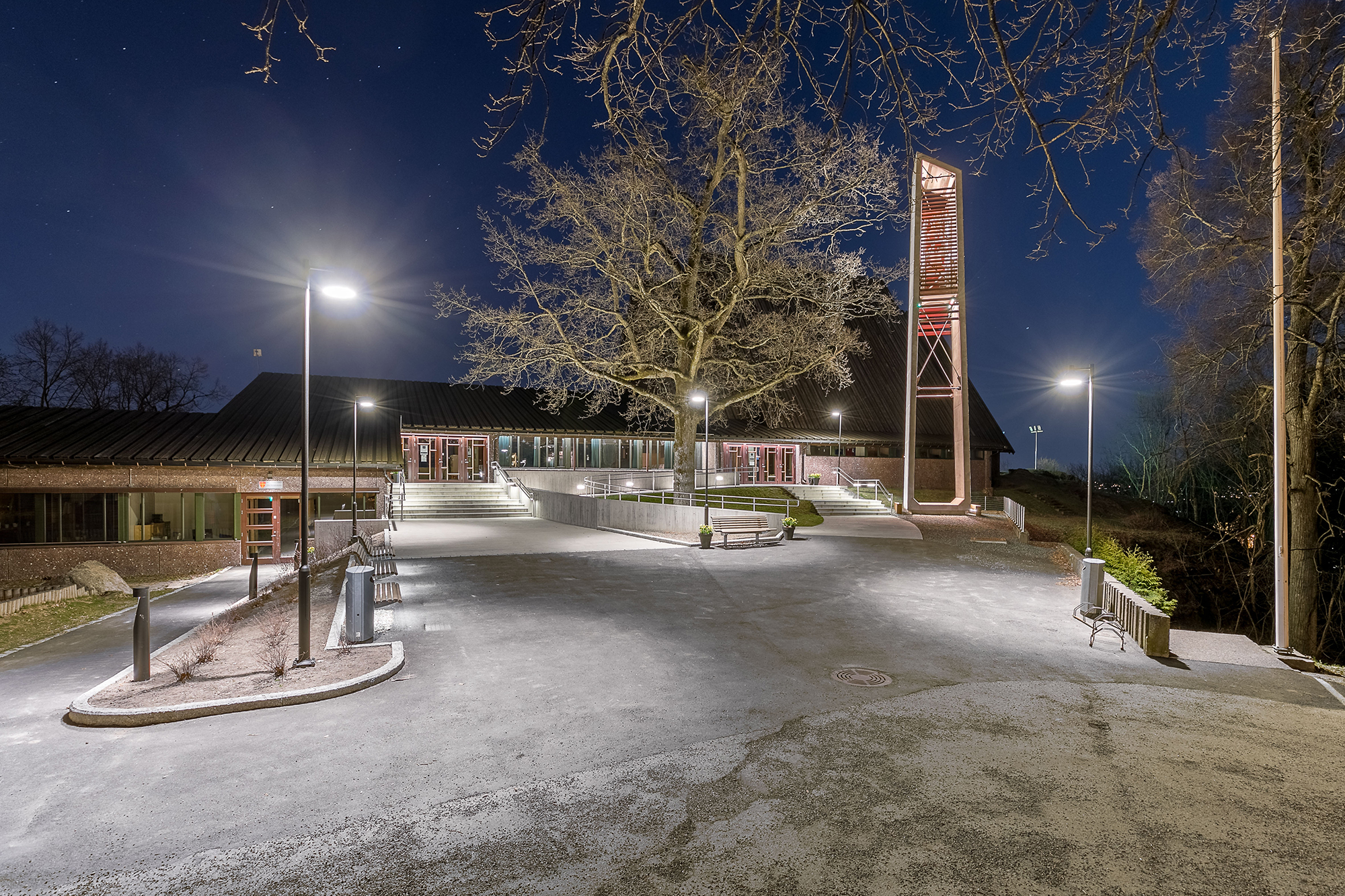 Jeløy kirke ble innviet i 1975 og er tegnet av Eva og Bernt Mejlænder. Kirken med sin beliggenhet ligger på en høyde med utsikt over hele byen. Bygningen er også kjent for Victor Sparres glassmaleri som dekker hele den søndre veggen. Inngangspartiet og forplassen trengte en oppgradering. Opprinnelige klokketårn var i meget dårlig teknisk tilstand med fare for å kunne rase. Prosjektet gikk ut på å gi klokketårnet en ny form. Designet er utført i formstøpt betong med ny klokkestol. Materialer er glatt betong og corten-stål. Lyssettingen gir en variert opplevelse av tårn med forplass.